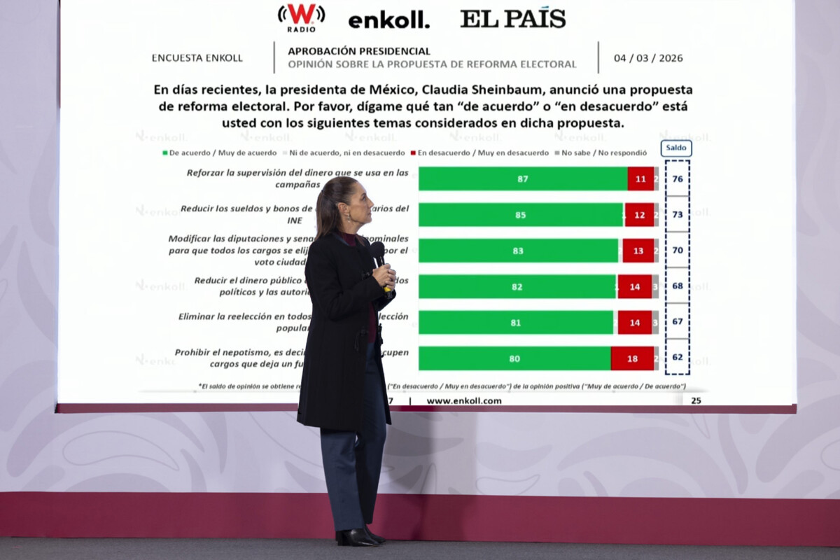Asimismo, Sheinbaum Pardo registró una aprobación de 75% en marzo, un aumento de un punto porcentual respecto al mes previo, según pesquisas de la casa encuestadora Enkoll, con un respaldo general superior de 80% de la ciudadanía en la operación militar contra “El Mencho” y de la reforma electoral.