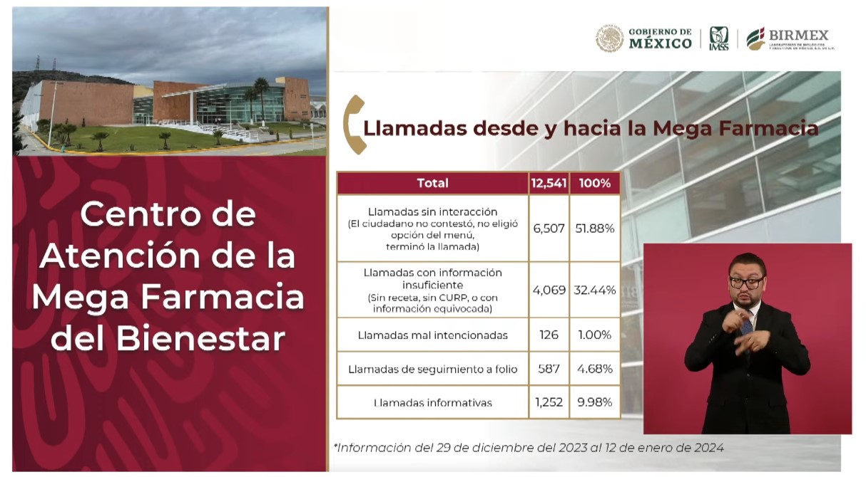 “Si estos datos coinciden, podemos seguir adelante. Entonces, tenemos 4 mil 69 llamadas que no tienen o CURP o no tienen la receta. Significa que no podemos verificar que la persona exista o que tiene una receta que hay que atender. Hay 126 llamadas malintencionadas, pues imagínense ustedes los motivos”.