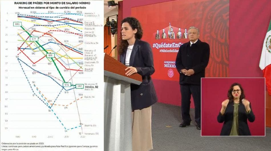 Luisa María Alcalde, secretaria del Trabajo, explicó que en México el poder adquisitivo se depreció desde 1980 y los aumentos, del 16 por ciento de 2019 y del 20 por ciento de este año, detuvieron esta tendencia. Sin embargo, México se mantiene en el sitio 82 del ranking mundial de salarios mínimos.