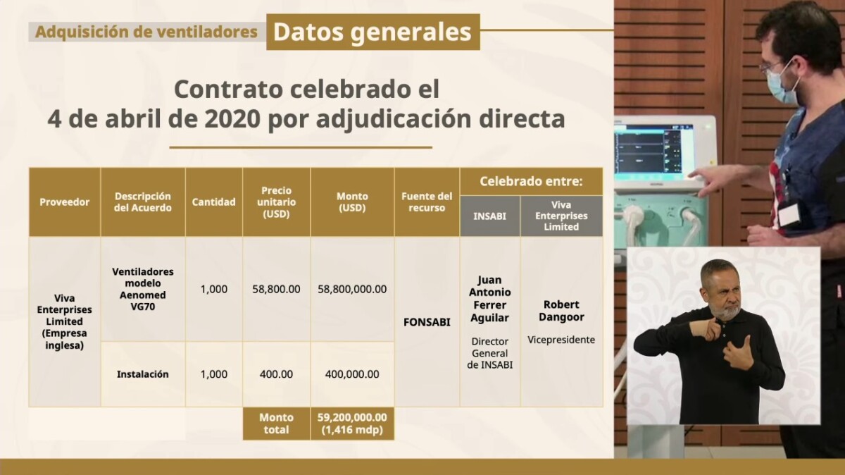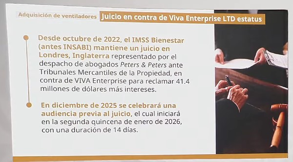 El gobierno federal mantiene denuncias, tanto en México, como en Reino Unido, en contra de la empresa inglesa Viva Enterprises Limited por incumplimiento de contrato y engaño, al no entregar 650 ventiladores AEON VG70, de un total de mil que se le compraron durante la pandemia de Covid-19. En este caso reclama 41.1 millones de dólares más intereses.