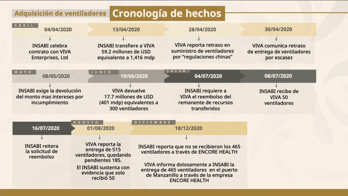 Abundó que la Fiscalía General de la República (FGR) continúa la investigación -iniciada en 2021- contra la empresa inglesa Viva Enterprises Limited por incumplimiento de contrato, al no entregar 650 ventiladores AEON VG70.