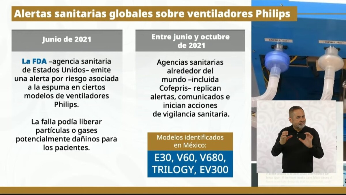 Poco después, en junio de 2021, la Administración de Alimentos y Medicamentos (FDA, por sus siglas en inglés) de Estados Unidos —equivalente a Cofepris en México— emitió una alerta sanitaria por riesgos asociados a los ventiladores E30.