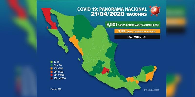 México suma 9 mil 501 casos y 857 muertos por coronavirus.- Autoridades de la Secretaría de Salud federal (Ssa) informaron que el número de casos confirmados de coronavirus aumentó a 9,501 en México.