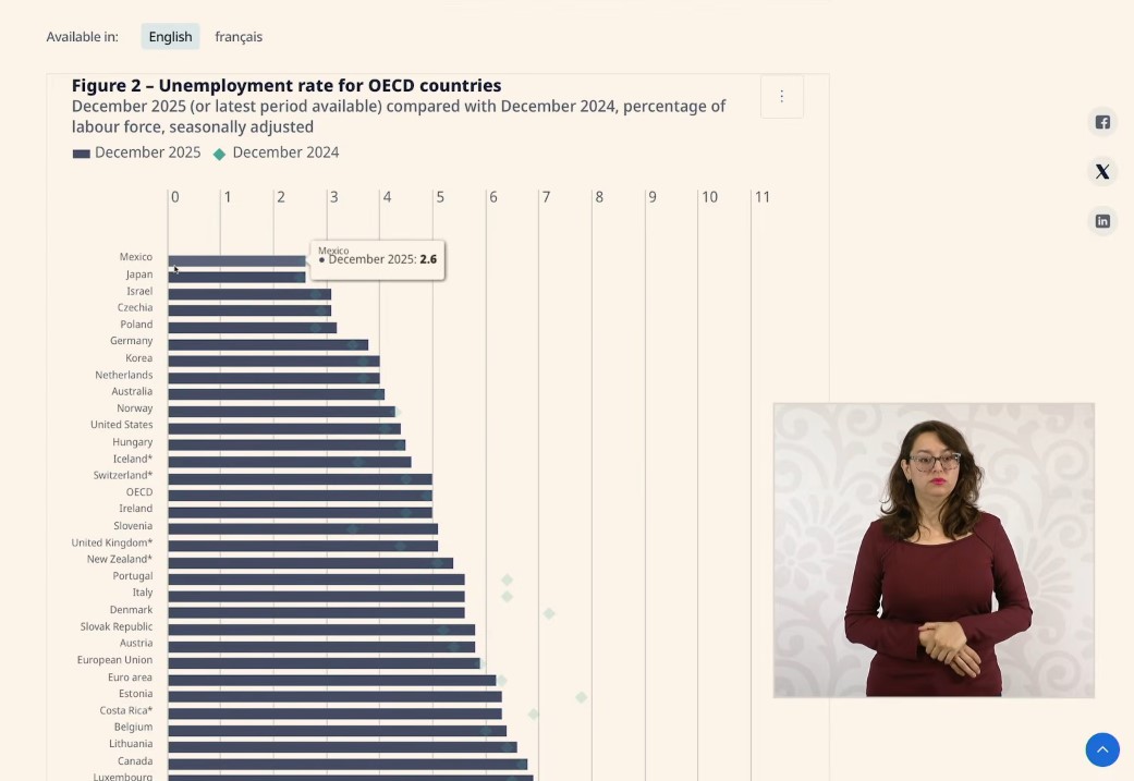 La presidenta Claudia Sheinbaum destacó que México mantiene la menor tasa de desempleo entre los países miembros de la Organización para la Cooperación y el Desarrollo Económicos (OCDE), con una tasa de 2.5% en diciembre de 2025, seguido por Japón (2.5%) e Israel (3.1%).