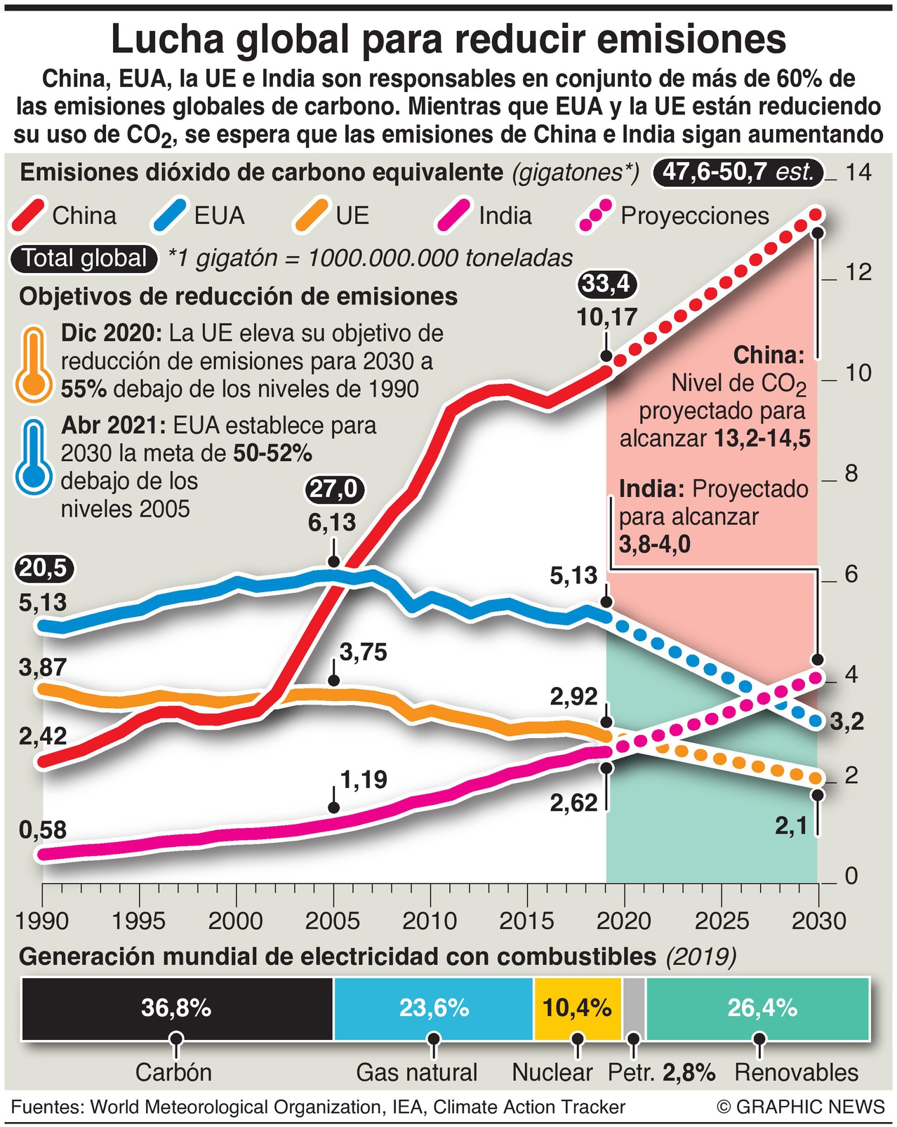 Agrega que la pandemia de covid-19 provocó una caída en las emisiones mundiales de 5.4 por ciento de bióxido de carbono en 2020. Sin embargo, se espera que en 2021 las emisiones de éste y otros GEI vuelvan a aumentar a un nivel ligeramente inferior al récord que se alcanzó en 2019. Se estima que apenas alrededor del 20 por ciento de las inversiones totales en recuperación hasta mayo de 2021 tengan un impacto en la reducción de las emisiones.