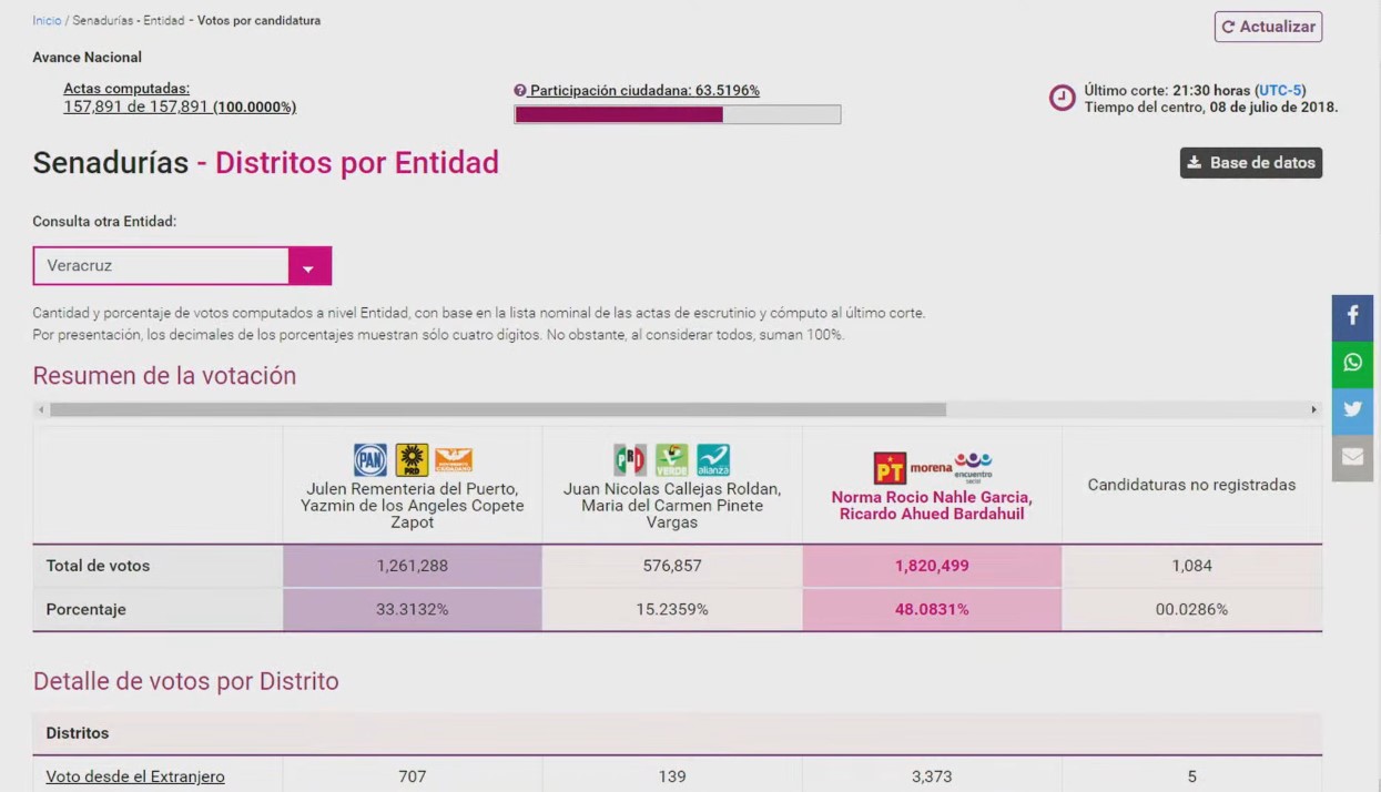En tanto por su origen zacatecano, López Obrador recordó que Nahle fue electa diputada federal (en 2015) por Veracruz; además que en 2018 fue elegida por mayoría al Senado de la República, por un millón 820 mil votos, equivalentes a 48 por ciento, muy por arriba de su más cercano competidor, Juan Remetería, quien abanderó a la coalición encabezada por el PAN y que obtuvo un millón 266 mil sufragios.