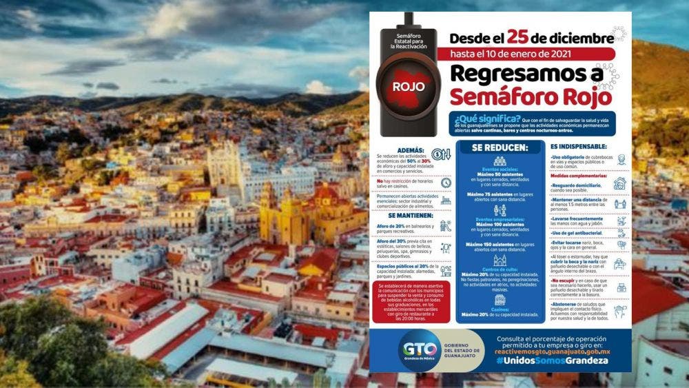 Las autoridades de el Gobierno de Guanajuato anunciaron que a partir del 25 de diciembre se volverá a instalar al Semáforo Rojo debido al repunte en los casos positivos de COVID-19 que se han reportado en las últimas semanas en esa entidad.