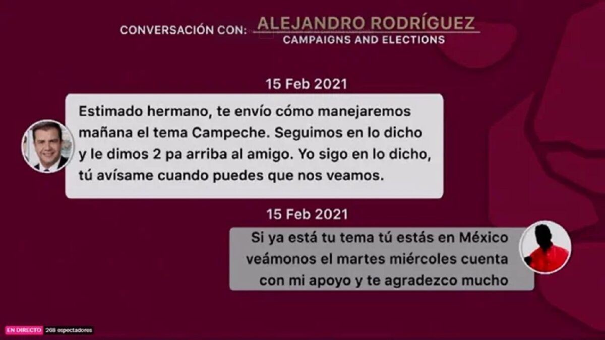 “Gracias por tu ayuda. Ayúdanos con todo, hay que hacerlo no sólo por el tema de ganar con el mejor proyecto, sino hay que hacerlo por México. Abrazo”, supuestamente indicó el exgobernador de Campeche el 6 de febrero de 2021.