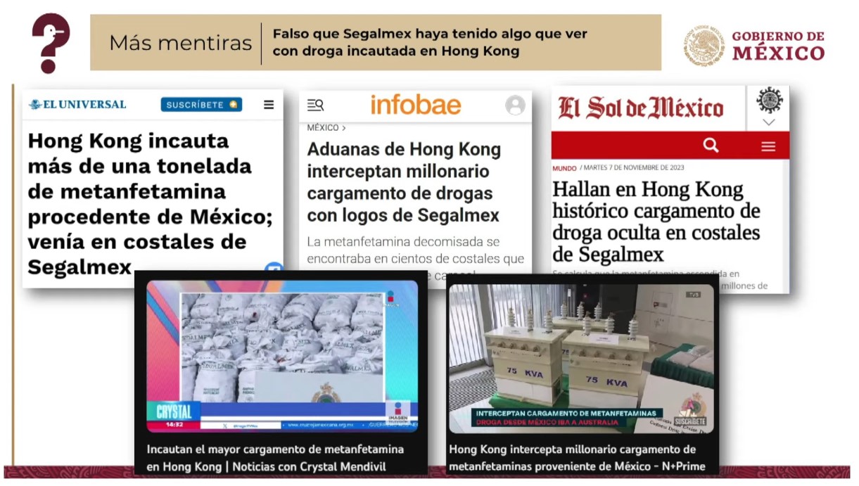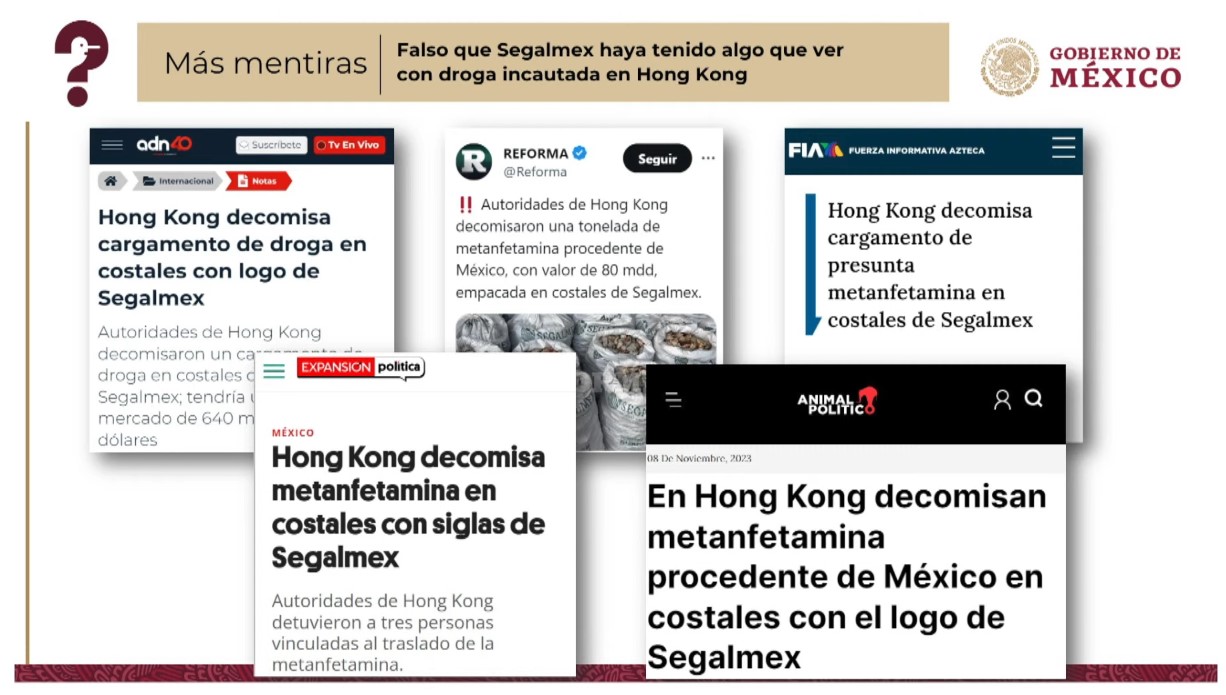 “Medios de comunicación y en redes sociales dijeron que funcionarios de gobierno traficaban metanfetaminas a China a través de costales de Seguridad Alimentaria Mexicana. Todo esto es falso. A través de un comunicado Segalmex informó que no realiza exportaciones de productos a ningún país”, indicó García Vilchis.