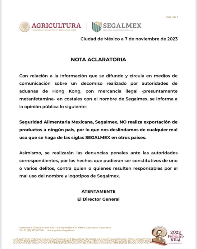 La institución mexicana Seguridad Alimentaria Mexicana (Segalmex) comunicó que no realiza exportaciones de productos a ningún país, esto debido a que en medios de comunicación se difundió la noticia en la que se informaba sobre un decomisó de metanfetaminas realizado por la Aduana de Hong Kong y en el cual los costales que transportaba el cargamento tenían el logotipo de Segalmex.
