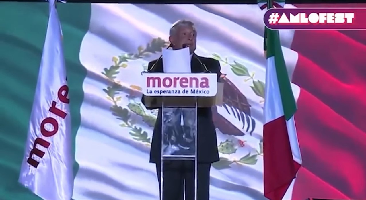 Enseguida se recupera un fragmento del discurso de López Obrador al festejar el triunfo del 1 de julio de 2018 cuando, dijo, “nos preparamos para iniciar la transformación del país” y para acabar con la corrupción.
