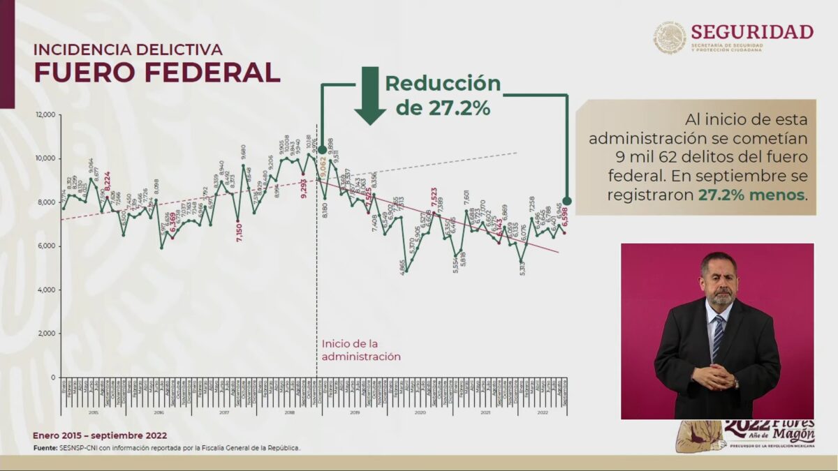 Durante la conferencia presidencial, Rodríguez mencionó que el homicidio doloso se redujo en 13.8 por ciento en el periodo enero-septiembre con respecto al mismo periodo de 2021. Recordó que este delito tuvo un incremento de 192 por ciento durante el sexenio de Felipe Calderón Y de 59 por ciento bajo la administración de Enrique Peña Nieto, mientras que en el periodo 2018-2022 hay una baja de 10.3 por ciento.