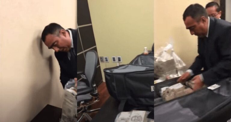 “¿Son doce en total?”, pregunta Caraveo mientras él y Gutiérrez guardan las bolsas con billetes en maletas, aunque la voz de la persona que graba las imágenes está alterada con un programa de edición.