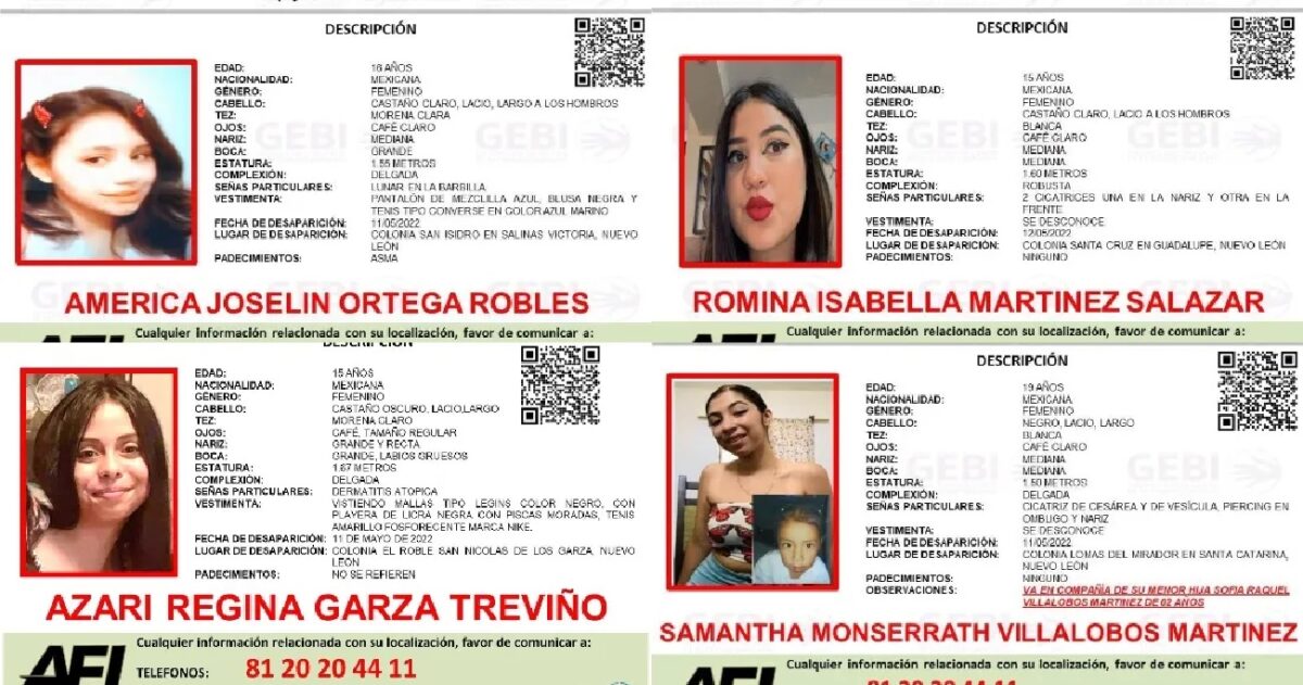 Las dos menores: America Joselin Ortega Robles, de 16 años; y Azari Regina Garza Treviño, de 15 años; fueron vistas por última vez el 11 de mayo. De igual manera, que Samatha Monserrath Villalobos Martínez, de 19 años, a quien se busca junto a su hija de dos años. Por su parte, Romina Isabel Martínez Salazar, de 15 años, desapareció el 12 de mayo.
