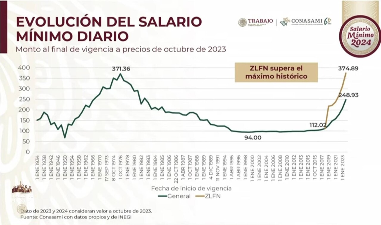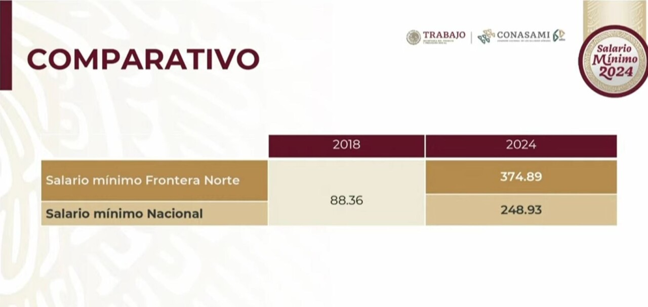 Bolaños presentó una tabla comparativa en la que se observa que al inicio del gobierno, en 2018, el salario mínimo nacional se ubicaba en 88.36 pesos, en consecuencia, al aumentar para 2024 a 248.93 pesos, se puede decir que durante este gobierno aumentó al doble y al triple en la zona libre de la frontera.