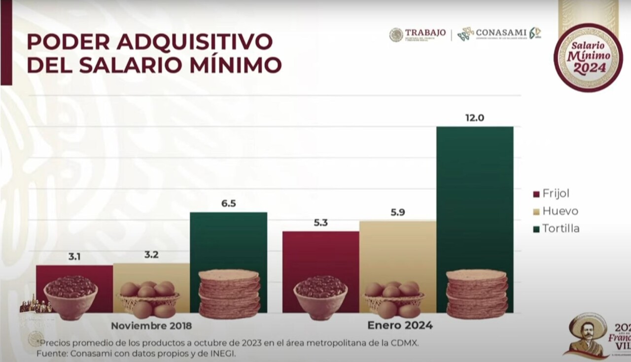 Durante la conferencia matutina, Bolaños detalló que al inicio del actual periodo presidencial, el salario mínimo alcanzaba para comprar 3.1 kilos de frijol, 3.2 kilos de huevo y 6.5 kilos de tortilla. A partir del 1° de enero de 2024 alcanzará para 5.3 kilos de frijol, 5.9 kilos de huevo y 12 kilos de tortillas.