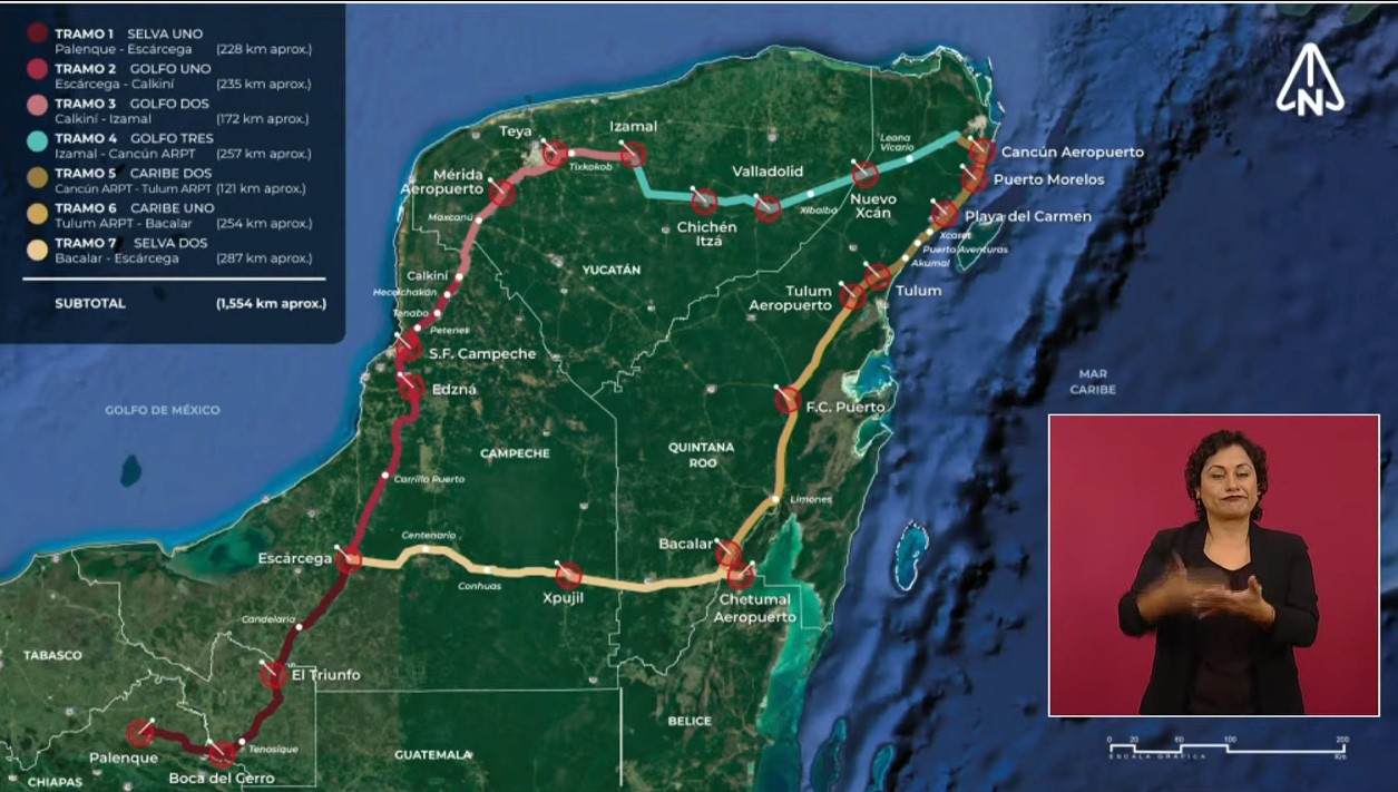 Del tramo de Tulum Cancún, que es el cuestionado por sus adversarios, “originalmente lo que teníamos pensado para hacerlo era utilizar la carretera. Hubo solicitud de los dueños de hoteles y se les concedió, también se pensó en hacer una especie de segundo piso, son 100 kilómetros, pero además de qué también por el tráfico se elevaban los costos, y también había protestas porque iba a ir el tren arriba muy cerca de donde están los hoteles, por eso se optó por un trazo nuevo que viene aquí en paralelo a la carretera en los espaldares de los terrenos en la parte de atrás, ya está resuelto todo el derecho de vía. Llegando a Tulum en efecto, para el proyecto contempla hacer viaductos para pasar por arriba, no se toca no se altera en nada los ríos subterráneos ni los cenotes.