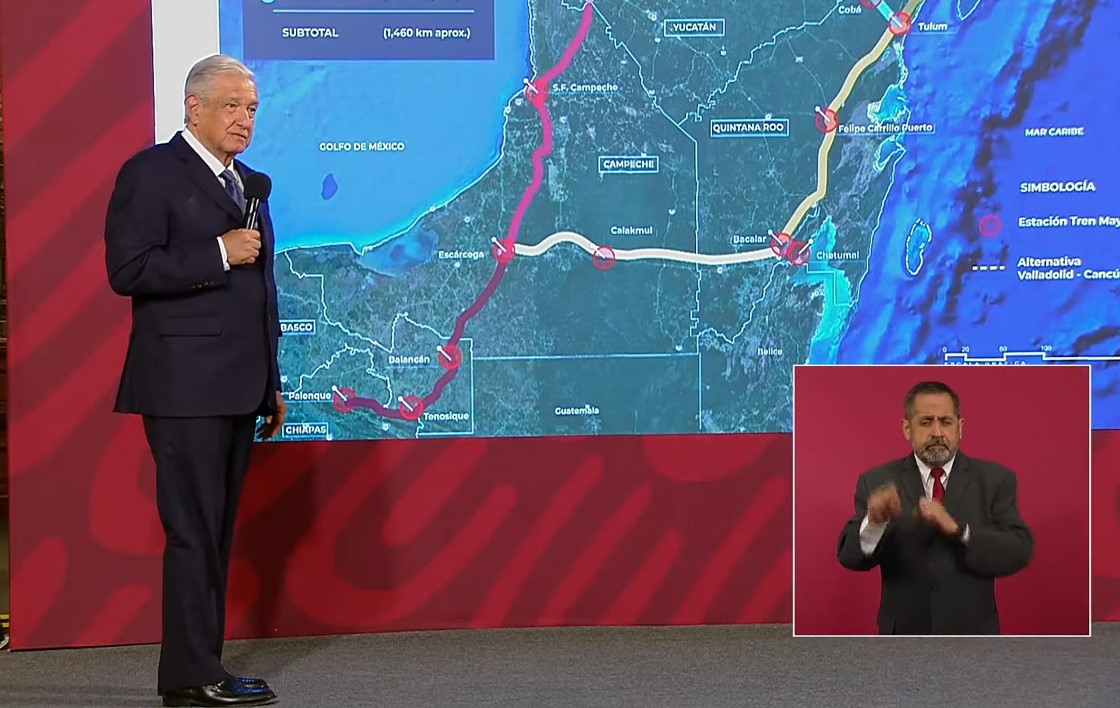 Durante más de 40 minutos, el tabasqueño se plantó frente al mapa de la obra, el cual utilizó para exponer los propósitos de la obra. Que lleguen acá a Cancún (los turistas) no sólo disfruten de la mar turquesa, sino que puedan introducirse por el lado del Caribe y del lado del golfo, y conocer más. Este tren va a ser de carga, trenes pasajeros para los que viven en toda la región y turístico, con desplazamiento hasta de 160 kilómetros por hora.