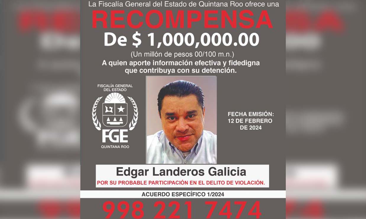 Mediante un comunicado difundido en sus plataformas digitales, la FGE de Quintana Roo ha ofrecido un millón de pesos como recompensa «a aquellas personas que proporcionen información veraz y útil que contribuya a la captura de Edgar Landeros Galicia», según se expresa en el mensaje.