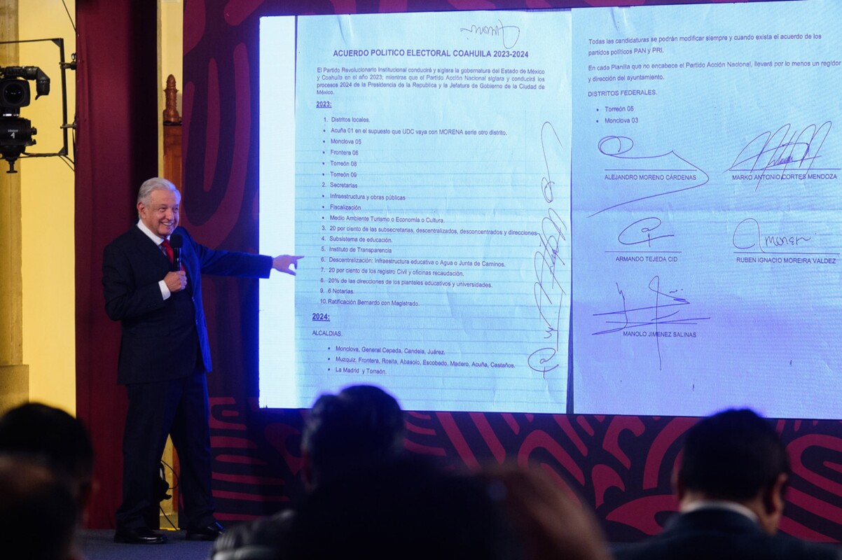 “Es oro molido”, consideró el presidente Andrés Manuel López Obrador el pacto electoral 2023 en Coahuila firmado por los dirigentes del PAN, Marko Cortés, y del PRI, Alejandro Moreno, —difundido por el propio panista—, en el que se evidenció un acuerdo para entregar una serie de prebendas y cargos por parte del tricolor al blanquiazul en el gobierno de ese estado.