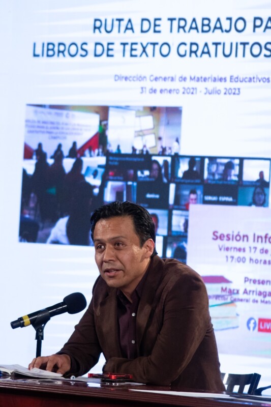 Marx Arriaga explicó que los libros de texto gratuito se hicieron con la participación de mil 998 maestros, los cuales fueron seleccionados a través de una convocatoria abierta que se lanzó para cualquiera que quería participar.