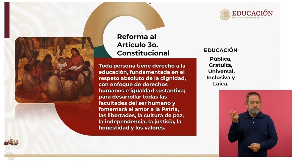 Ramírez informó que en 2019 se reformó el artículo tercero constitucional con el objetivo de que toda persona tenga derecho a la educación pública, gratuita, universal, inclusiva y laica.