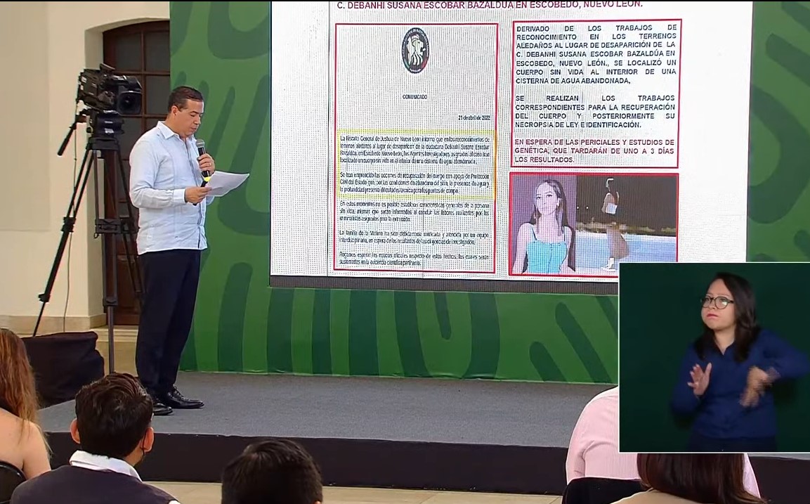Mejía informó este viernes que el cuerpo sin vida de una mujer ya fue recuperado de la cisterna de un motel donde fue encontrada y que, a falta de identificación oficial, un crucifijo que llevaba con ella coincide con el de la joven Debanhi Escobar, desaparecida el pasado 8 de abril en Escobedo, Nuevo León.