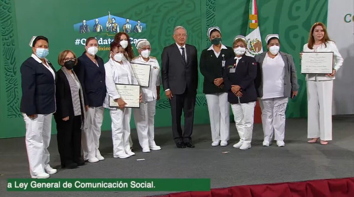 En la conferencia de prensa matutina se celebró el Día Internacional de la Enfermera, donde se entregaron reconocimiento a Fabiola Zepeda. Candelaria Avendaño, María Hortensia Castañeda, Guillermina Mendieta, Sandra Olimpia Gutiérrez y Claudia Leija, quienes, junto a sus compañeras y compañeros enfermeras y enfermeros, desempeñan una labor fundamental en la salud pública del país.