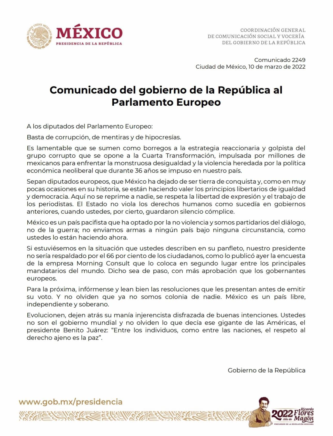 Evolucionen, dejen atrás su manía injerencista disfrazada de buenas intenciones. Ustedes no son el gobierno mundial y no olviden lo que decía ese gigante de las Américas, el presidente Benito Juárez: “Entre los individuos, como entre las naciones, el respeto al derecho ajeno es la paz”.