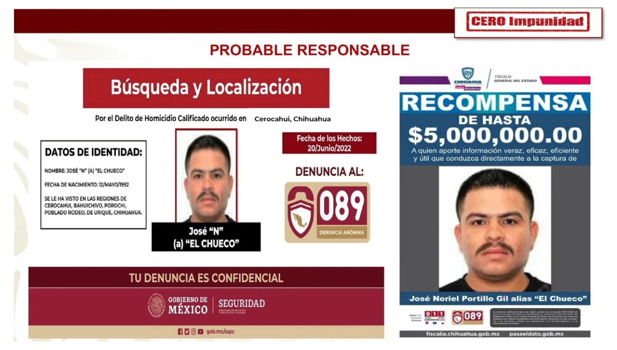 Asimismo, Roberto Javier Fierro Duarte, Fiscal General de Chihuahua, explicó que el pasado lunes se atendió el reporte en el que se informó que José Noriel Portillo Gil arribó a un domicilio de Cerocahui a fin de localizar a Paul, habitante de la comunidad, ya que días antes se había llevado a cabo un partido de béisbol patrocinado por “El Chueco” y tras haber sido derrotado, se generó una disputa con el otro equipo, en el que contendían los hermanos Paul “B” y Armando “B”.