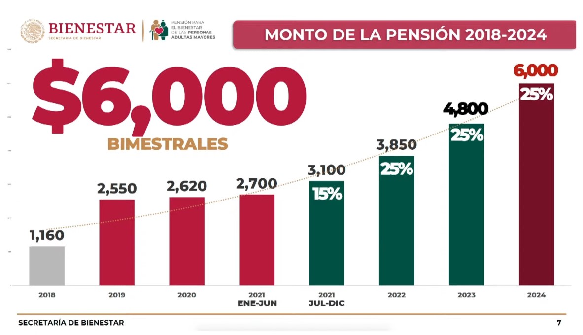 Añadió que en el gobierno de López Obrador la pensión pasó de mil 160 pesos bimestrales en 2018 a 2 mil 550 en 2019 y, con aumentos constantes durante el sexenio, a 6 mil pesos en 2024.