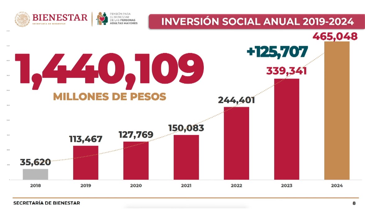 Especificó que la pensión de adultos mayores tendrá al final del sexenio una inversión acumulada de un billón 440 mil 109 millones de pesos.