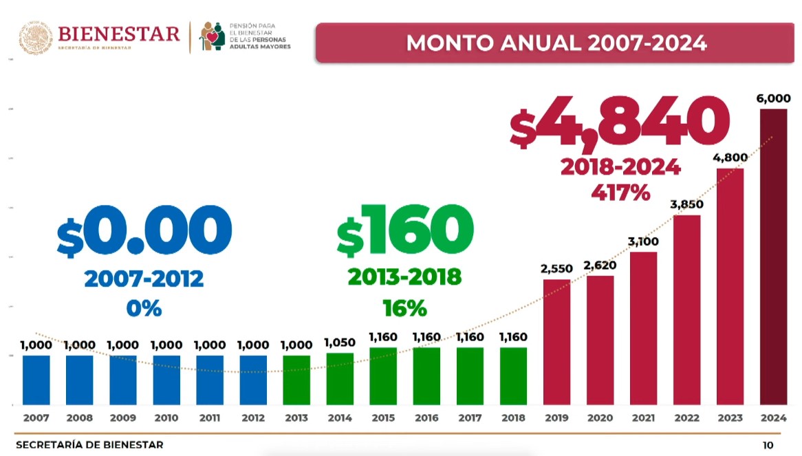 Desde el inicio del Gobierno de la Cuarta Transformación, esta pensión se ha incrementado 4 mil 840 pesos, lo que significa 417 por ciento más en comparación con 2007. De esta manera, se ha quintuplicado la iniciativa.