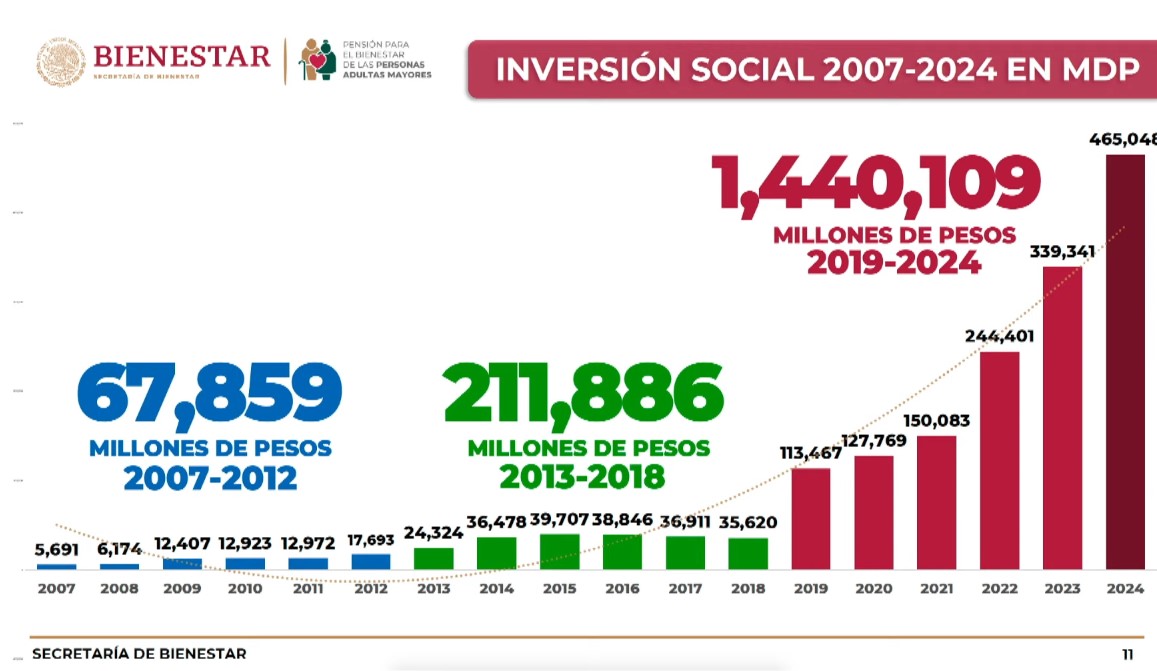 El actual gobierno federal orientó en el sexenio un billón 440 mil 109 millones de pesos en beneficio de adultos mayores, a diferencia de los 67 mil 859 millones de pesos entre 2006-2012 y de 211 mil 886 millones de pesos, de 2012 a 2018.