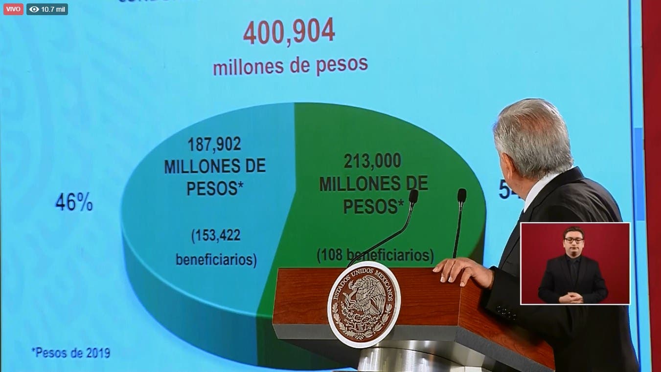 Durante su conferencia de prensa matutina, detalló que de los 400 mil millones de pesos condonados, 46 por ciento, es decir, 187,902 millones de pesos tuvieron 153 mil 422 beneficiarios. Mientras que el otro 54 por ciento, los cuales corresponden a 213,000 millones de pesos contemplan alrededor de 108 beneficiarios.