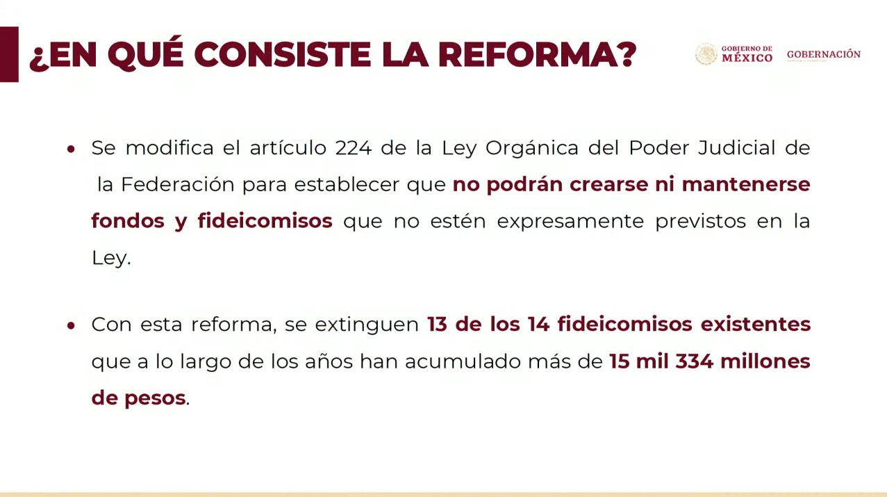 Subrayó que de los 14 fideicomisos, 13 no están contemplados en la ley, y en ellos se han acumulado más de 15 mil 334 millones de pesos.