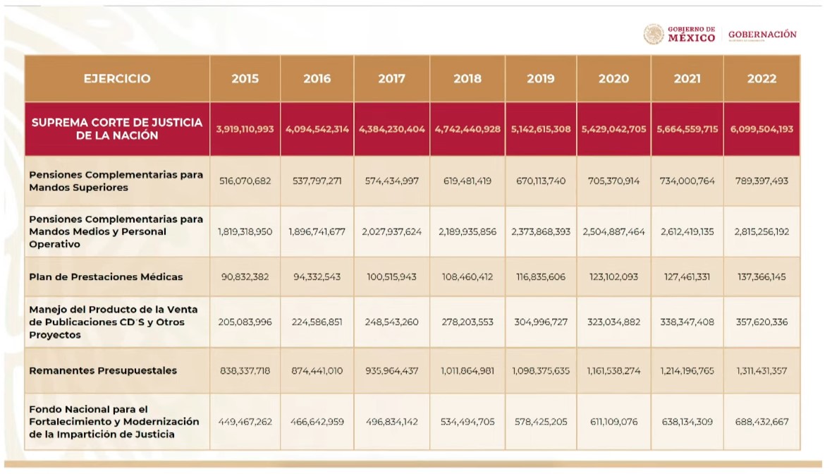 Así, por ejemplo, para Pensiones Complementarias de Mandos Superiores, el PJF solicitó para 2024 181 millones 254 mil 884 pesos.