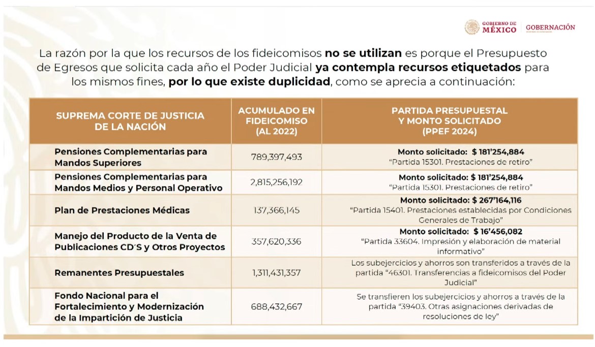 Afirmó que hay duplicidad en estos recursos, pues los recursos de los fideicomisos no se utilizaron porque en el Presupuesto de Egresos que solicita cada año el Poder Judicial ya contempla recursos etiquetados para los mismos fines.