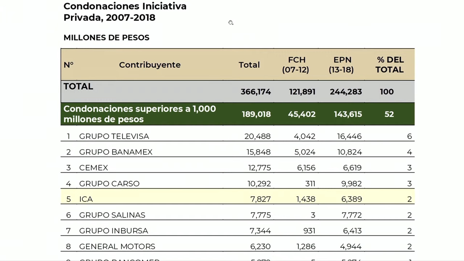 Además, mostró que esta firma fue la segunda más beneficiada de la condonación de impuestos entre las administraciones de Felipe Calderón y Enrique Peña Nieto, lo que implicó en esos periodos un total condonado por 15,848 millones de pesos.