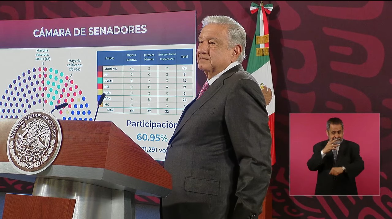 Para mostrar que en “una verdadera democracia el pueblo manda”, presentó los resultados de los cómputos distritales realizados en el Instituto Nacional Electoral desde el miércoles pasado y que cerraron ayer, donde se da el triunfo aplastante a la coalición Sigamos Haciendo Historia, con la Presidencia, siete de nueve gubernaturas, mayoría calificada en la Cámara de Diputados y casi mayoría calificada en el Senado.