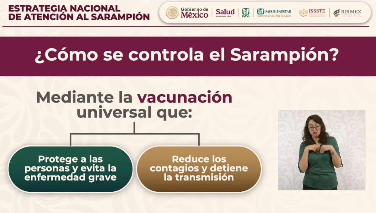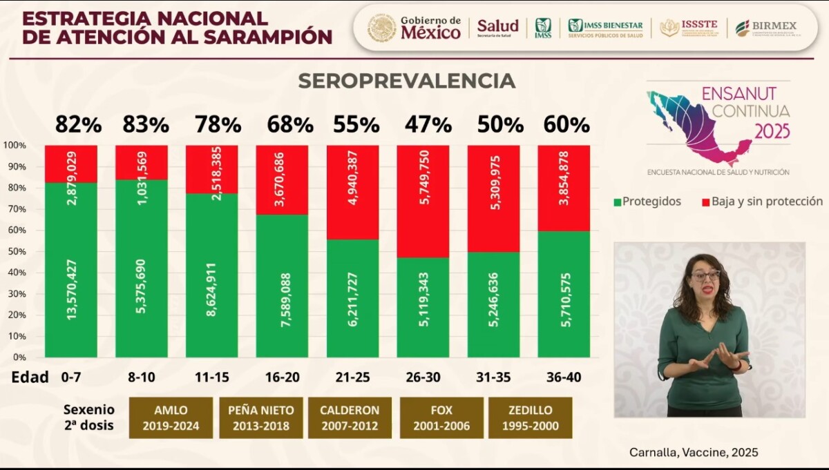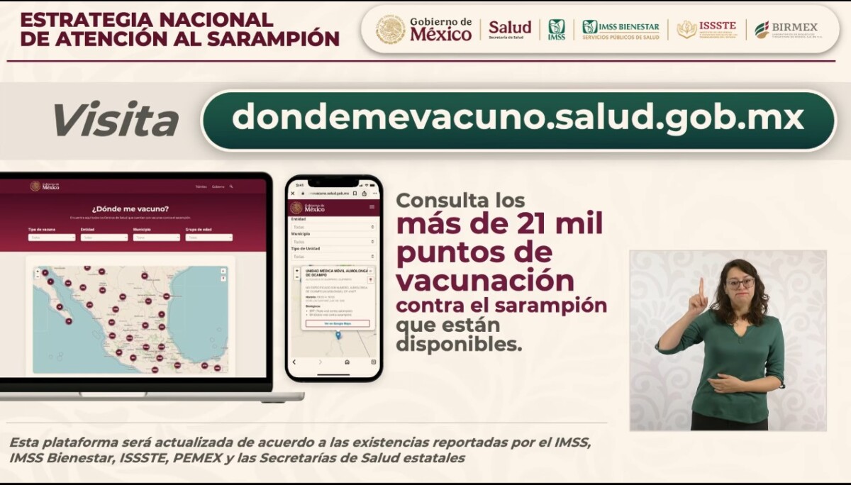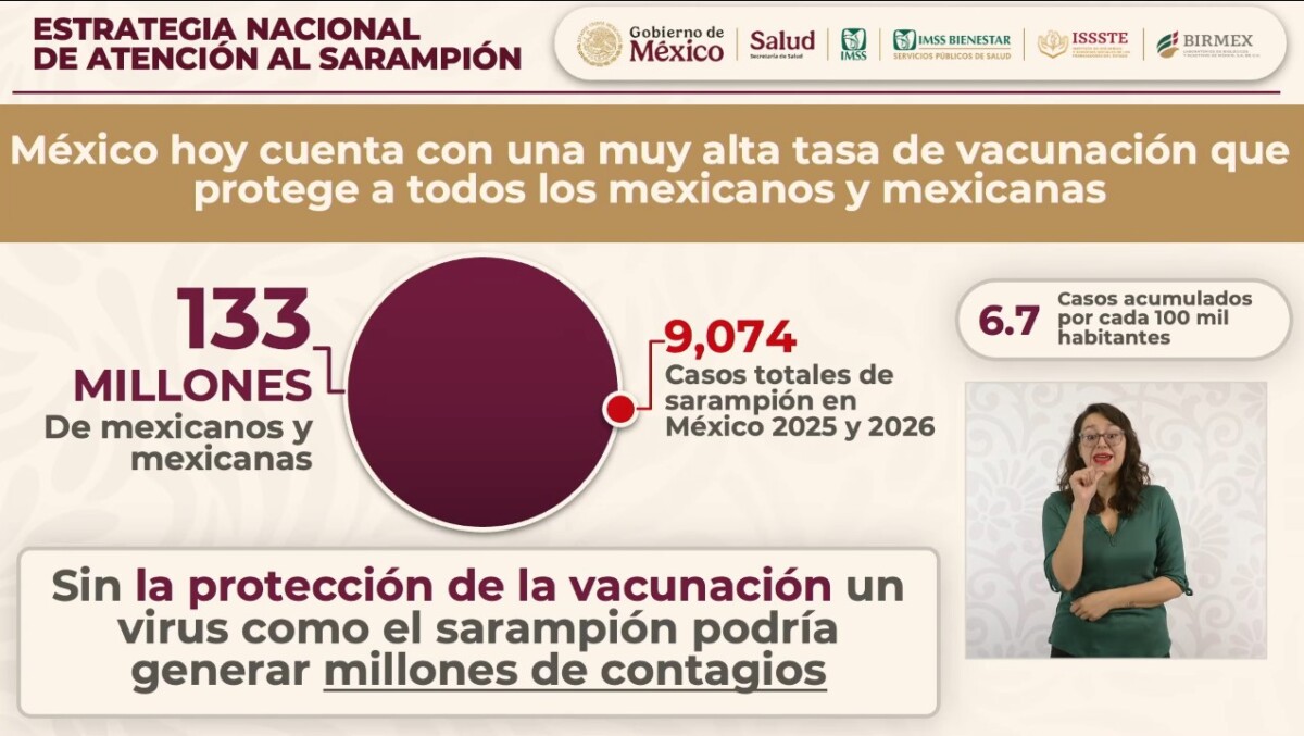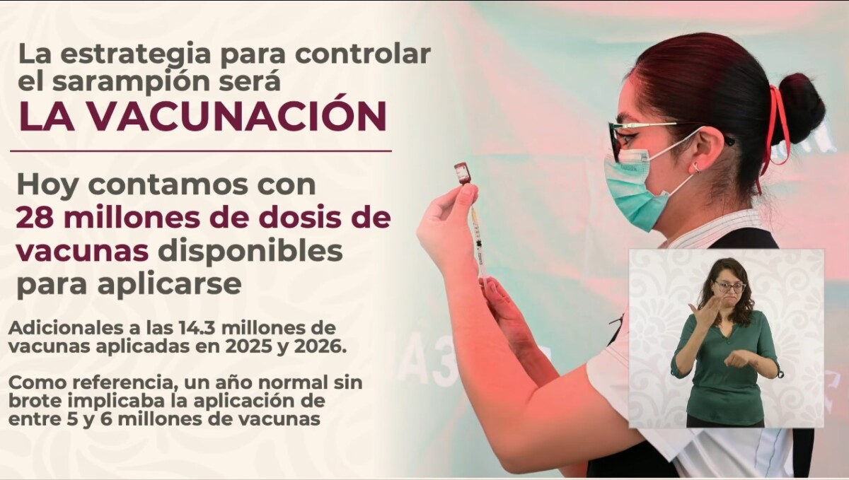 La Secretaría de Salud (Ssa) informó que para hacer frente a la transmisión del sarampión, se compraron 27.3 millones de vacunas, de las cuales más de 23 millones ya están disponibles para su aplicación. Durante 2025 y hasta el pasado 6 de febrero se han administrado 14 millones 297 mil 330 dosis.