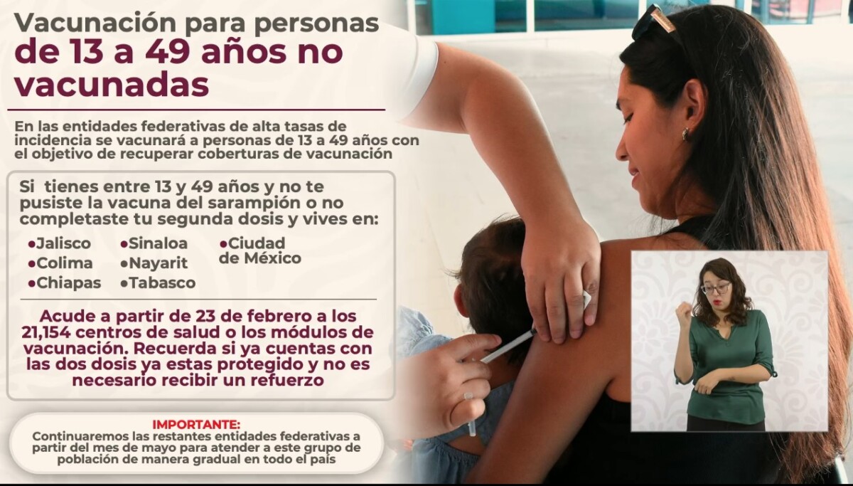 También deben recibir una dosis las personas menores de 49 años que no cuenten con el esquema completo de vacunación o no recuerden haberla recibido, así como los jornaleros agrícolas, migrantes y población de alta movilidad, especialmente en las entidades con mayor incidencia de la enfermedad.
