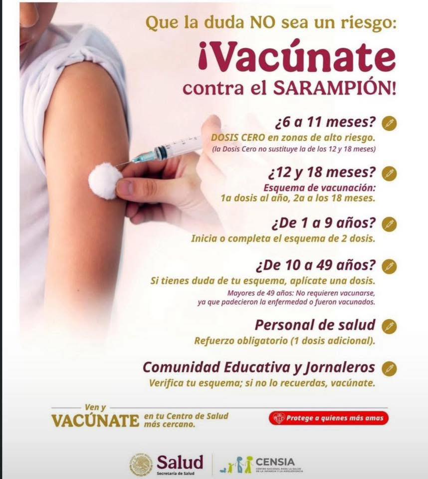 La dependencia federal indicó que también se aplica el inmunógeno a bebés de seis a 12 meses de edad si viven en zonas con brotes activos de sarampión. Ellos reciben una dosis denominada “0” (cero).