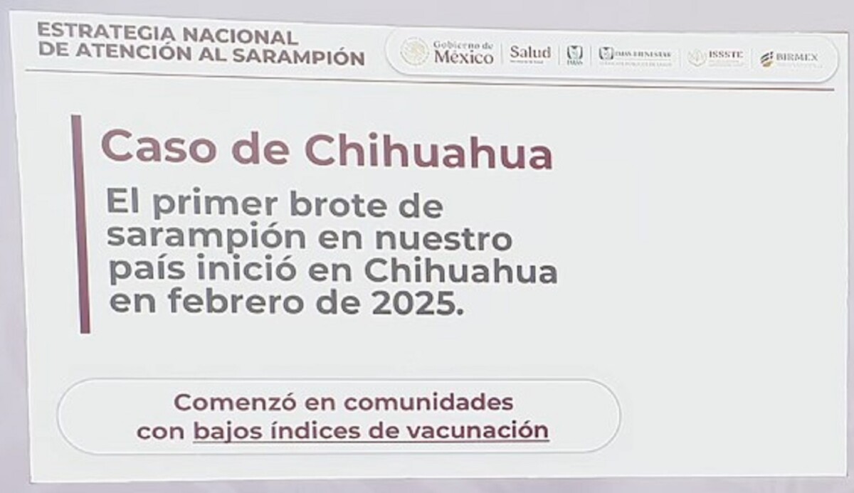 El origen del brote de sarampión en México se dio por las personas que no se vacunan, tanto en México como en Estados Unidos y Canadá. La Presidenta Claudia Sheinbaum señaló que es por ello que se dio en Chihuahua, entidad que tiene más de 4 mil casos acumulados entre 2025 y 2026.