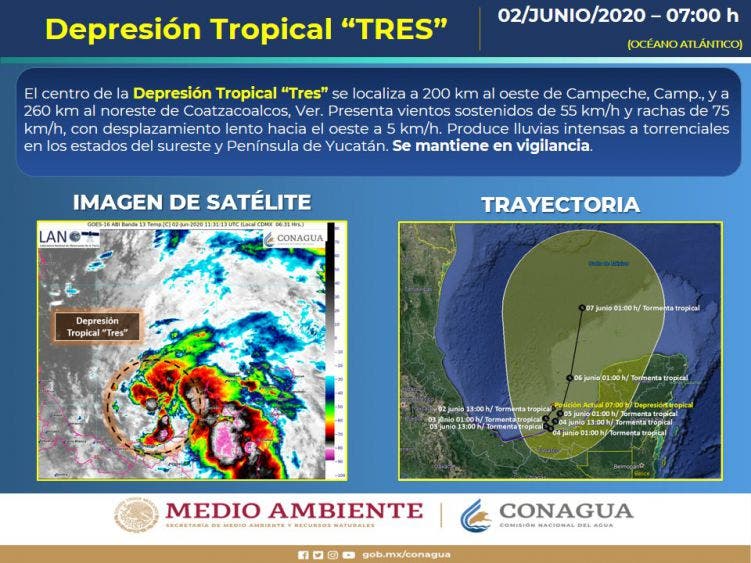 La Comisión Nacional del Agua (Conagua) informó que la depresión tropical “Tres” producirá intensas lluvias en Campeche, Chiapas, Oaxaca, Quintana Roo, Tabasco, Veracruz y Yucatán, por lo que pidió extremar precauciones en esos estados.