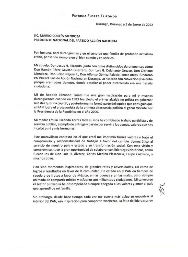 Flores Elizondo, sobrina de Rodolfo Elizondo Torres, exsecretario de Turismo de Calderón y vocero de Vicente Fox Quesada, alegó en su carta de renuncia dirigida a su presidente, Marko Cortés Mendoza, que se formó en el PAN que tenía ideales que ya no existen.