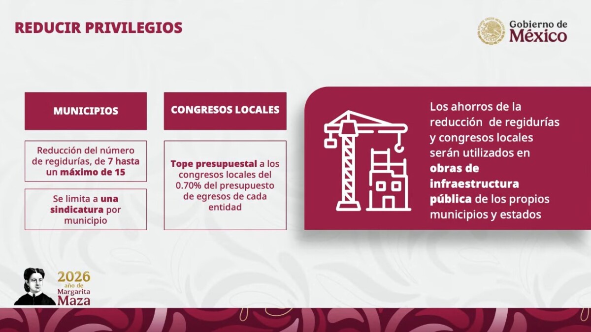 La reforma plantea asimismo la disminución del presupuesto anual de las legislaturas estatales, nueva integración de los ayuntamientos y la reducción gradual de 15 por ciento de los recursos del Senado, a partir de 2027.