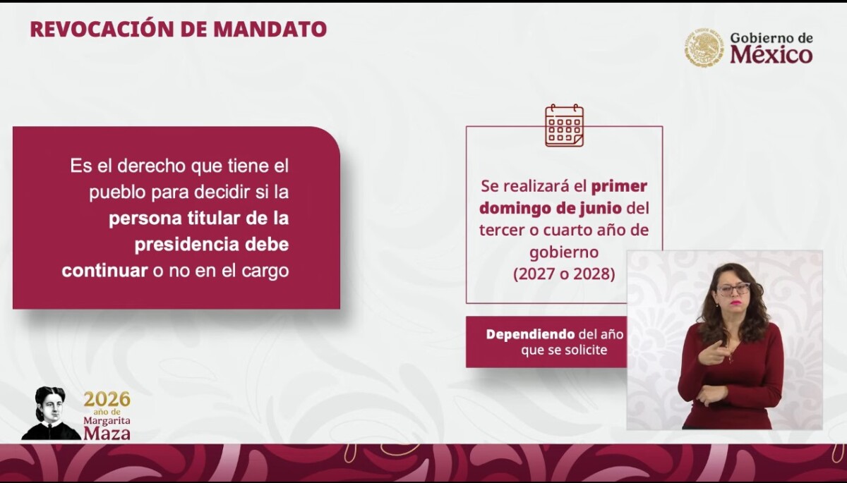 Por lo que se refiere a la revocación de mandato de quien esté al frente de la Presidencia, además de que podrá llevarse a cabo el tercer año de gobierno y no sólo en el cuarto como se ordena ahora en el artículo 35 Constitucional, la reforma da otras facultades a la mandataria.