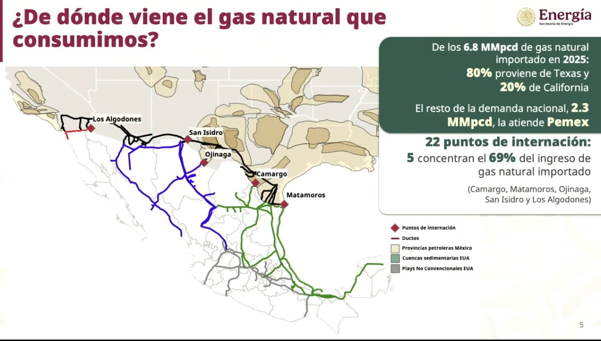 Luz Elena González, secretaria de Energía, señaló que cerca del 74% del gas natural que se consume en nuestro país es importado principalmente de Estados Unidos, lo que representa riesgos en el suministro ante coyunturas externas o conflictos internacionales.