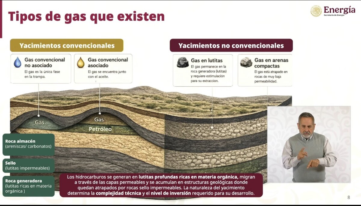 La jefa del Ejecutivo planteó que en México hay dos tipos de yacimientos de gas natural, el convencional y el no convencional, el segundo tiene mayores reservas, de ahí que se analice su explotación.